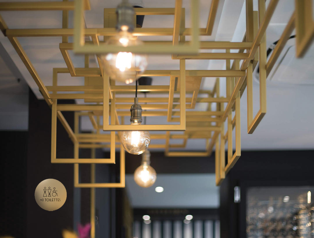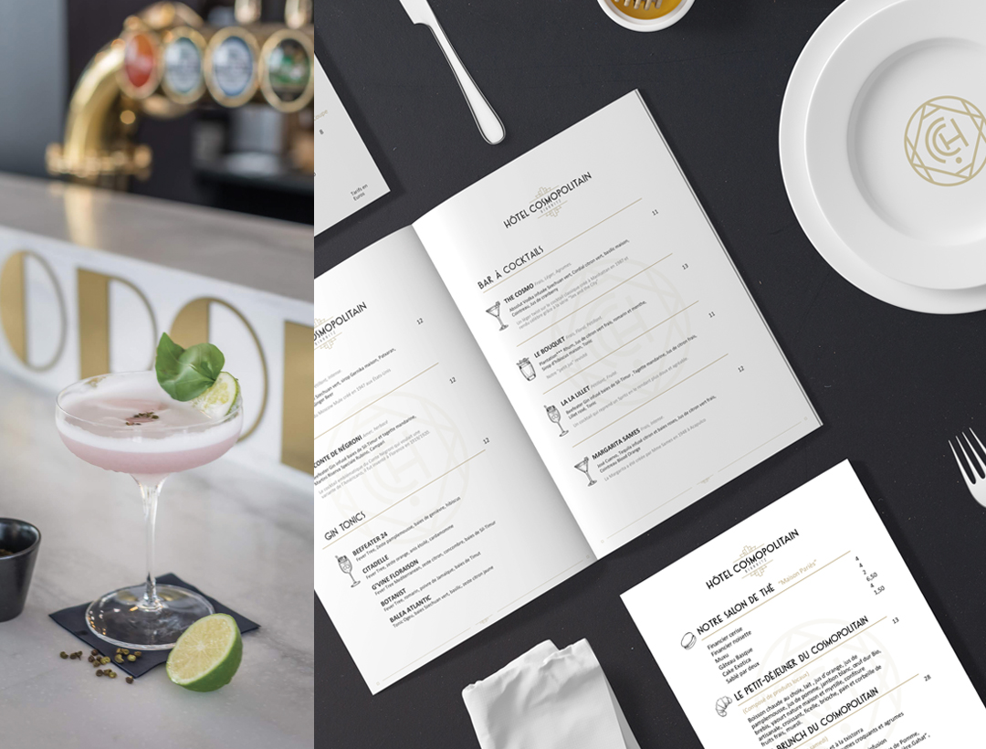 et charte graphique : papeterie, menus, flyers, signalétique, enseignes.